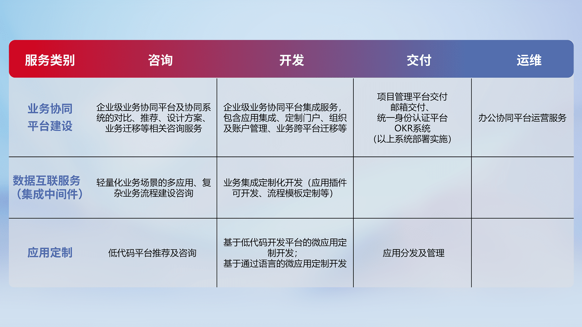 针对钉钉、、企微、、、IDaas等平台级产品提供产品的规划、、方案、、、、交付、、、定制化开发等服务,,,,实现如统一协同办公、、智能客户服务、、、、混合会议管理、、、、智能数据查询、、、等业务场景,,实现数字化转型。。