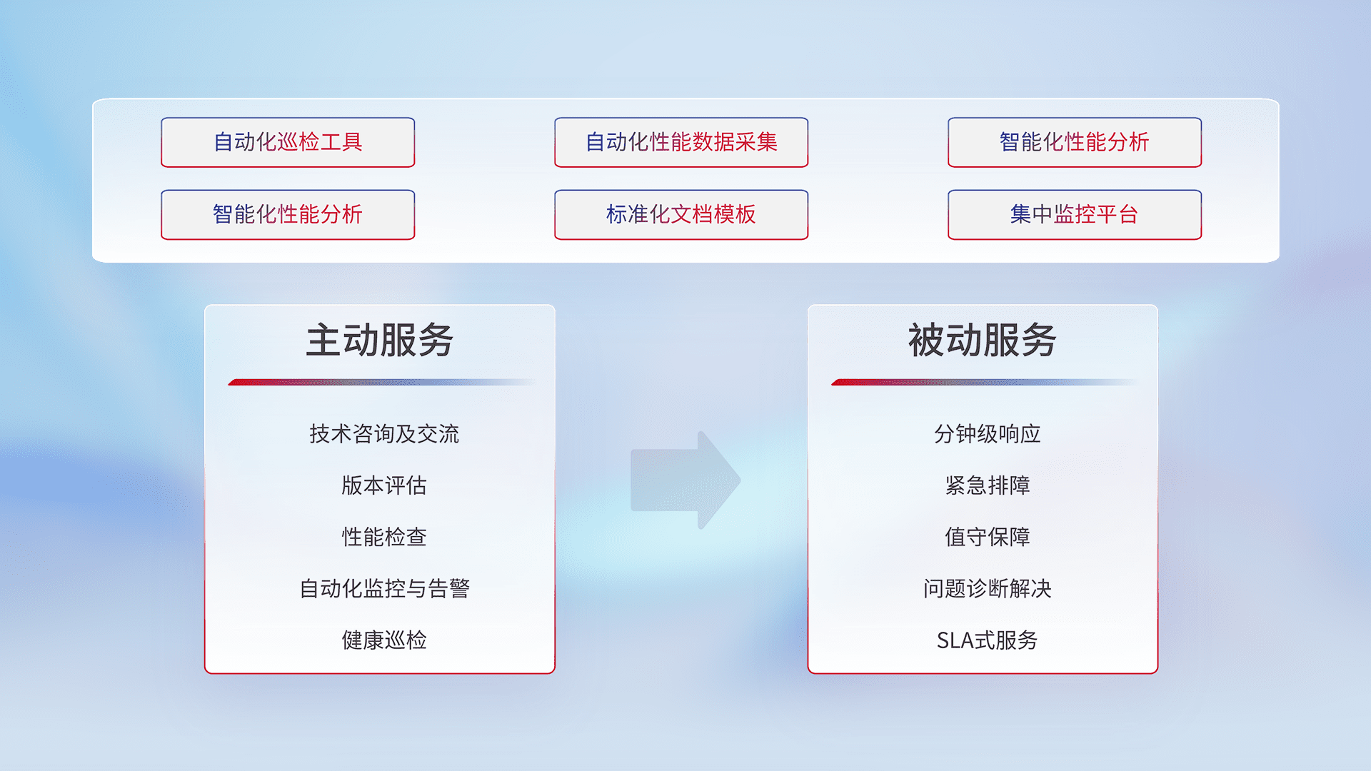 智能化工具和标准化文档,,保障服务质量,,,,提供主动服务(包含技术咨询、、、、版本评估、、性能检查、、、自动化监控与告警、、健康巡检)和被动服务包含(分钟级响应、、、、紧急排障、、值守保障、、问题诊断解决、、、SLA服务)。。。