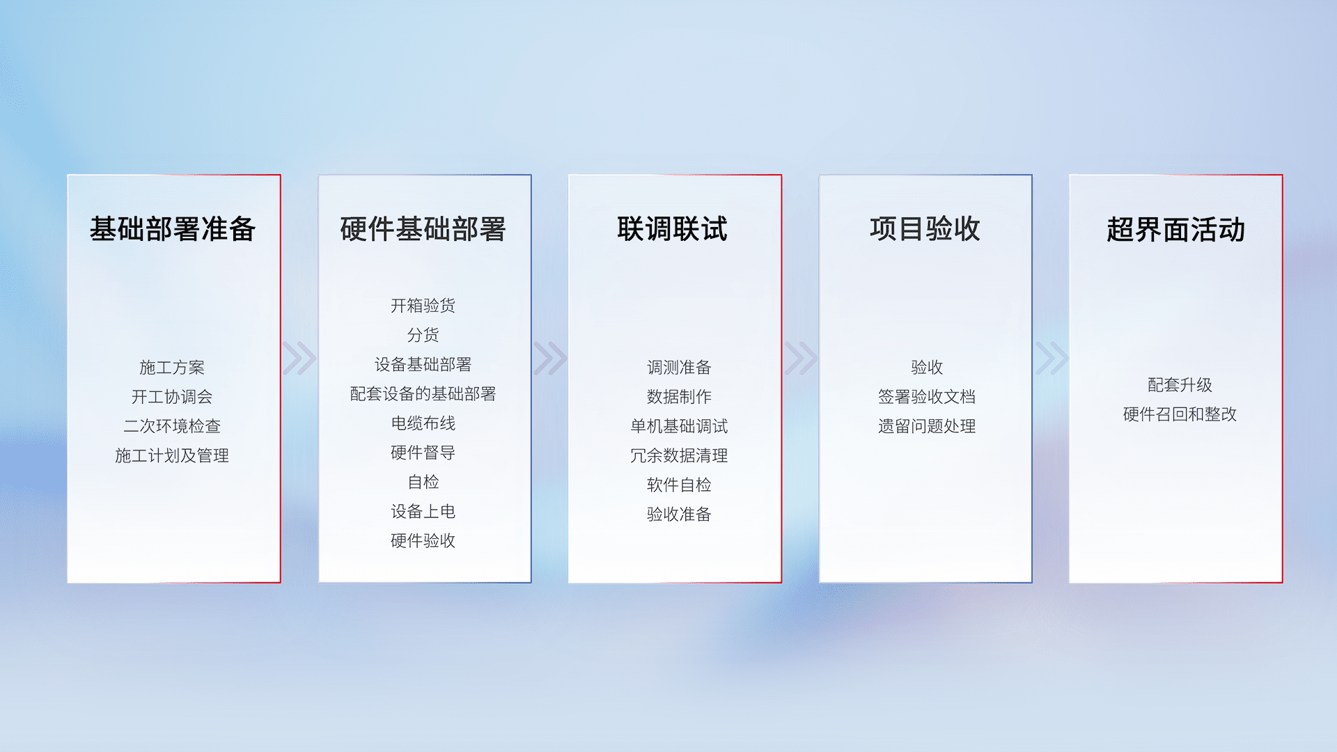 从基础部署准备、、、硬件基础部署、、、联调联试、、、项目验收、、、越界面活动的全过程可追溯,,保证施工质量和进度。。。